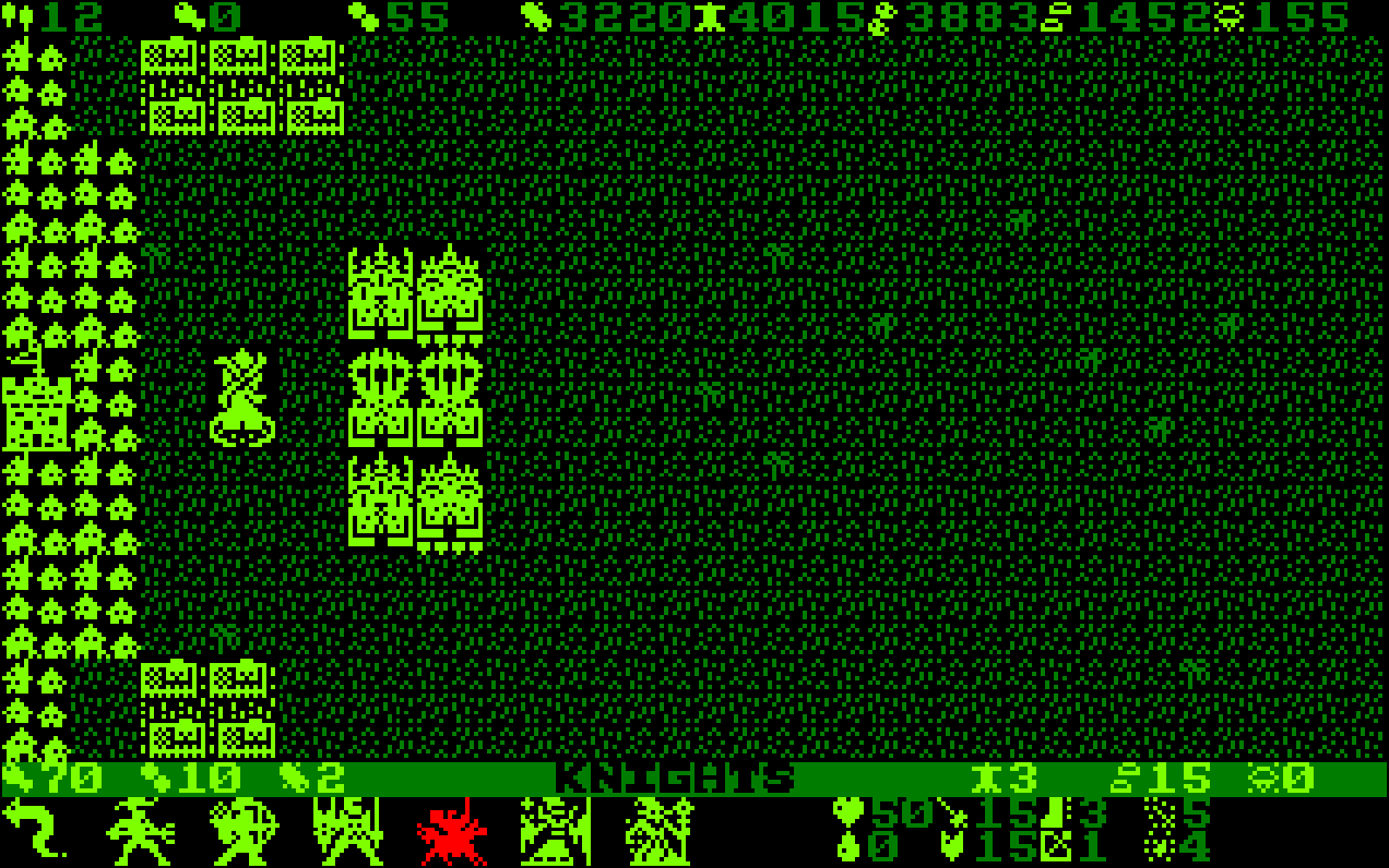 This is a very small city-builder project I wrote for the Amstrad CPC computers. It's written fully in locomotive basic and uses UDGs for its graphics. One of 24 governors can be chosen and his or her leadership and magic-based stats can be slightly enhanced. The game's main interface is set through several icons. As of version 0.12, building and destruction of created buildings to recover resources is possible. All available buildings can currently be created on the map as long as the resources cost is covered. Food is consumed but without consequences at this point and buildings produce resources related to them normally. All available combat units can be seen in the training options, but at this point cannot yet be recruited or deployed on the map. The 'e' key can be used to cancel the building and destruction options when navigating the map.